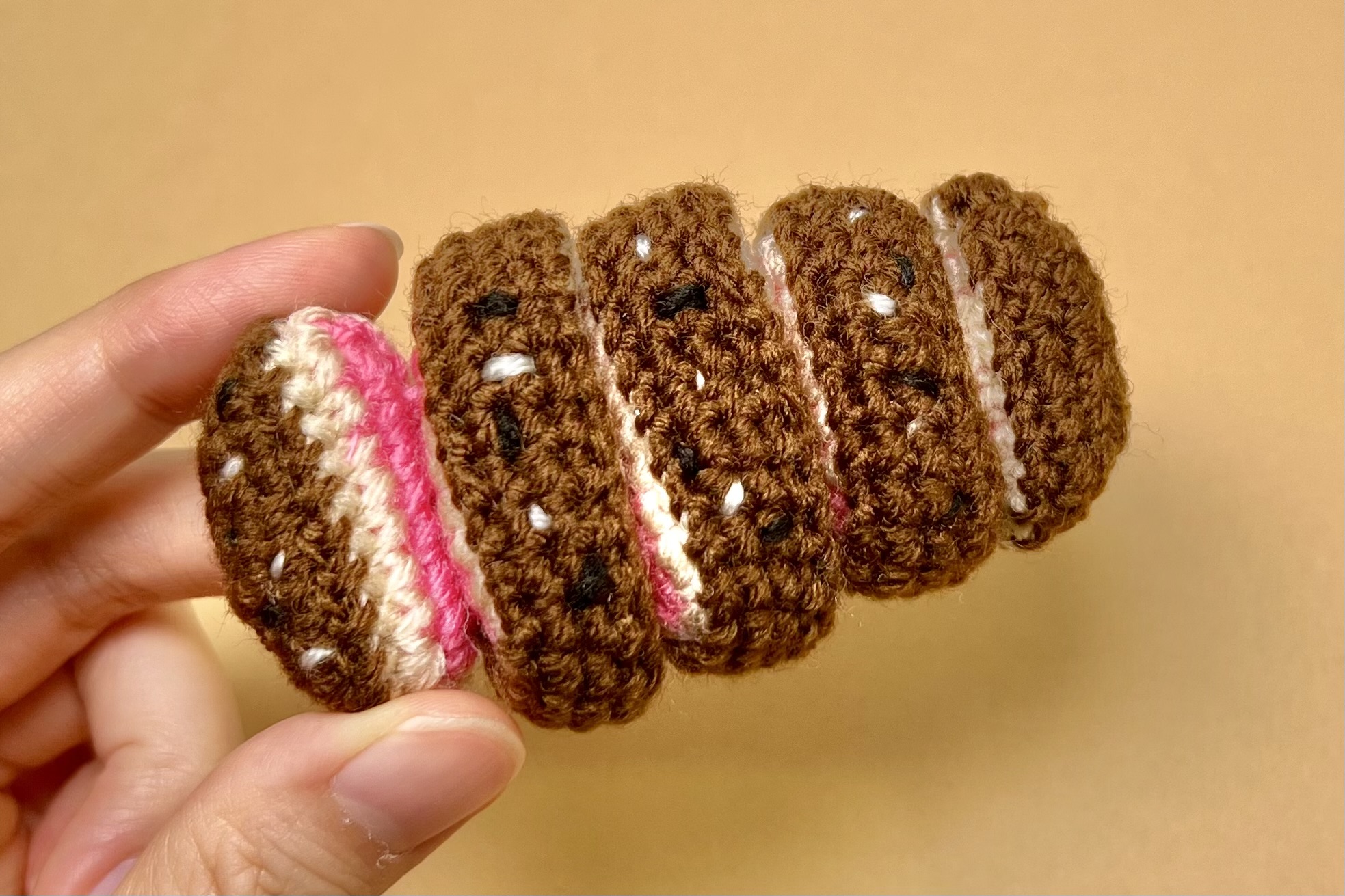 7〜8段目の間に糸を通して、3つの枝を作るように縫い合わせます